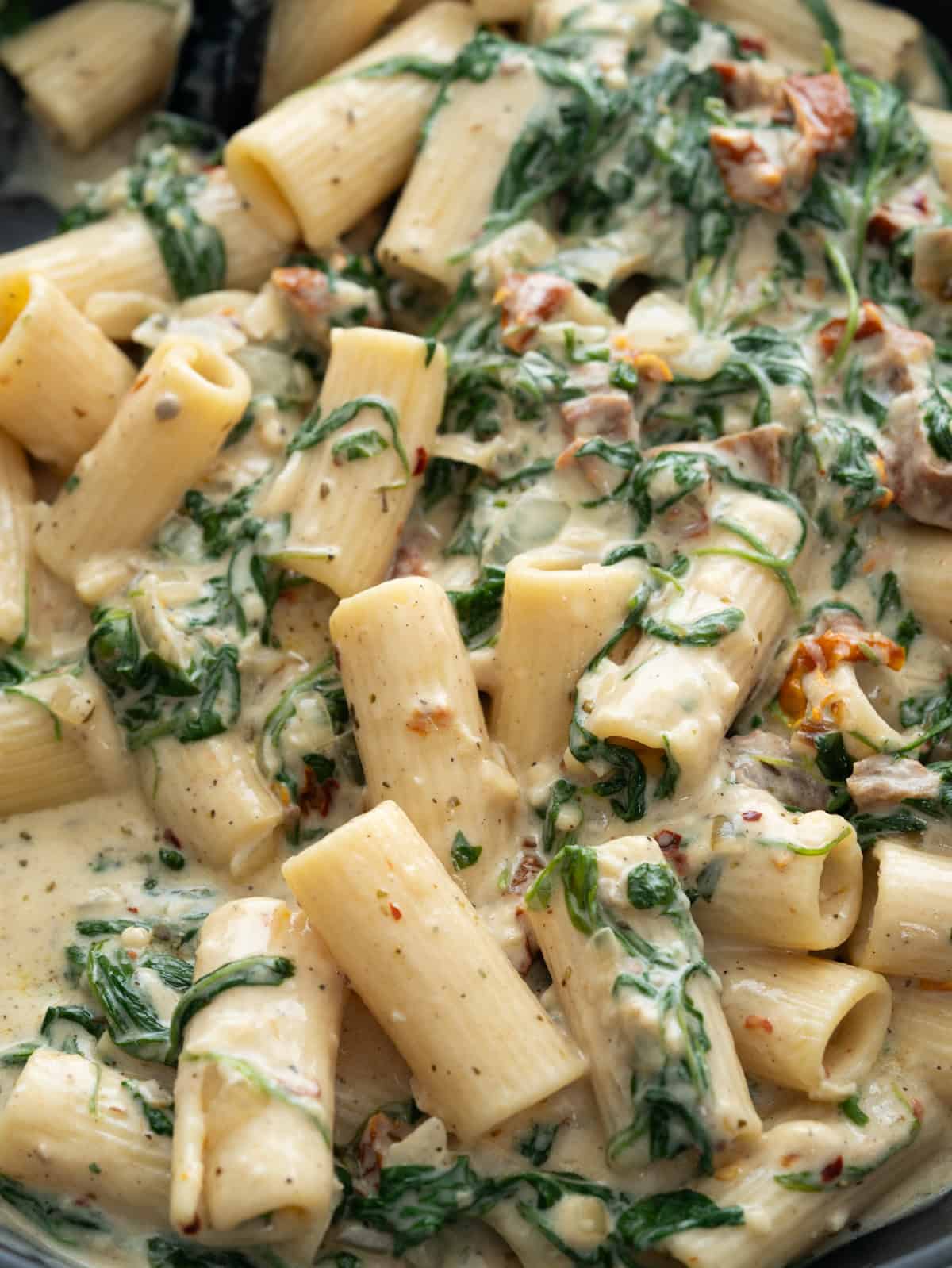 If I could choose the only way to have my greens, then it would be this spinach rigatoni pasta in a creamy, garlicky cream cheese parmesan sauce. Sundried tomatoes add a pop of brightness to the sauce, making this spinach pasta an easy weeknight dinner.