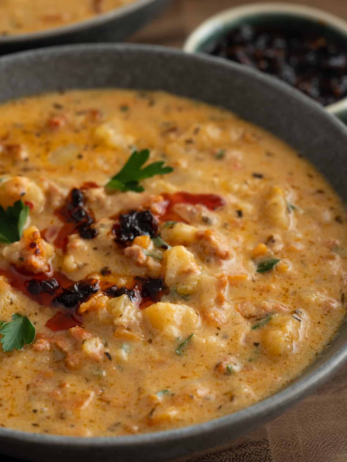 Using an Instant pot for this recipe saves half of your time. It takes less than 30 minutes from start to finish to make this soup. Potatoes are cooked tender soft and soaks up all the flavours.