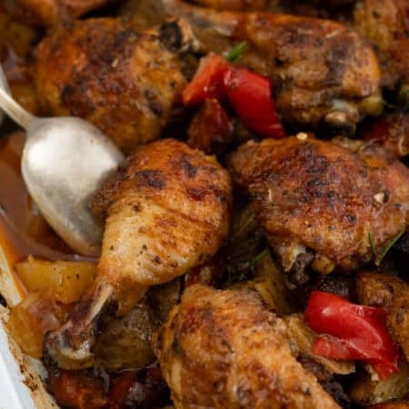This is one of those recipes that needs a minimal list of ingredients, but always turns out flavor-packed, all thanks to smoky Spanish chorizo. Bone-in chicken thighs and drumsticks coated with a simple seasoning and baked along with veggies , all in one pan. The potatoes and veggies soaks up all the flavour, making this a perfect dinner. The chicken