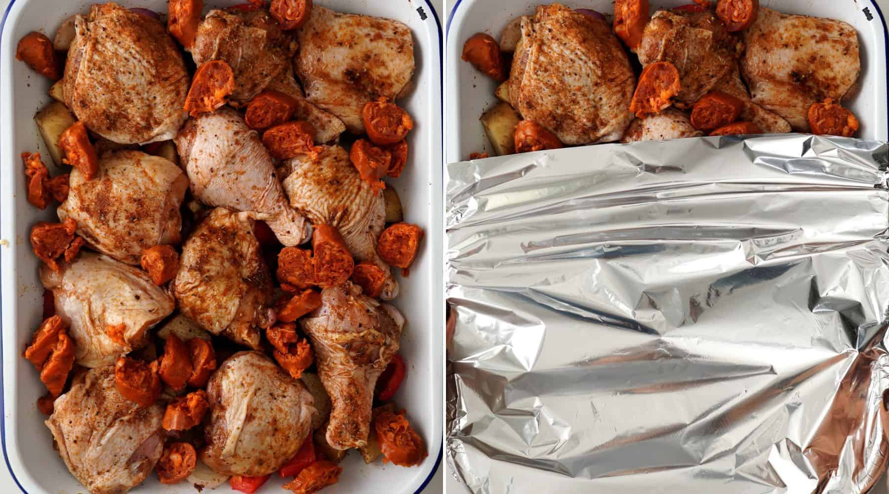 - Arrange seasoned chicken pieces in a single layer, and put sliced chorizo in the gaps in between. Loosely cover the baking tray with aluminum foil and bake it for 30 minutes.