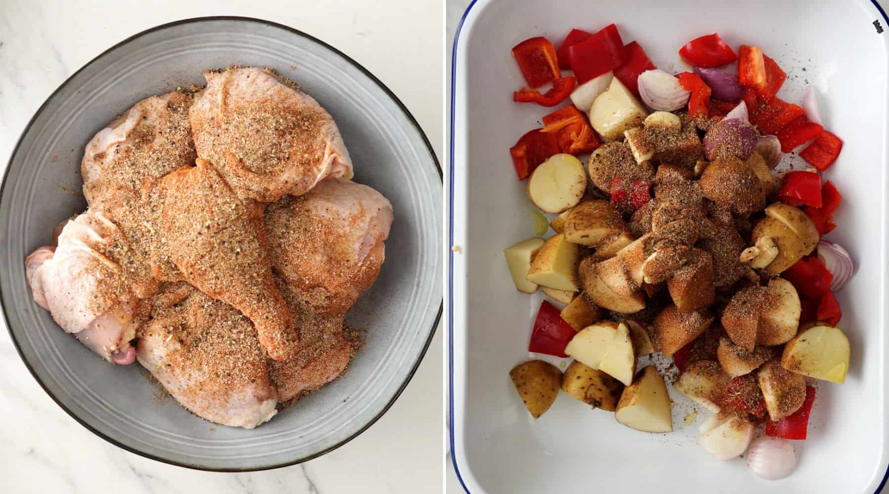 - Prep Chicken by patting it dry with a kitchen towel. Toss it with a tablespoon of oil. Sprinkle 2 tablespoons of the above seasoning blend and coat the chicken well.