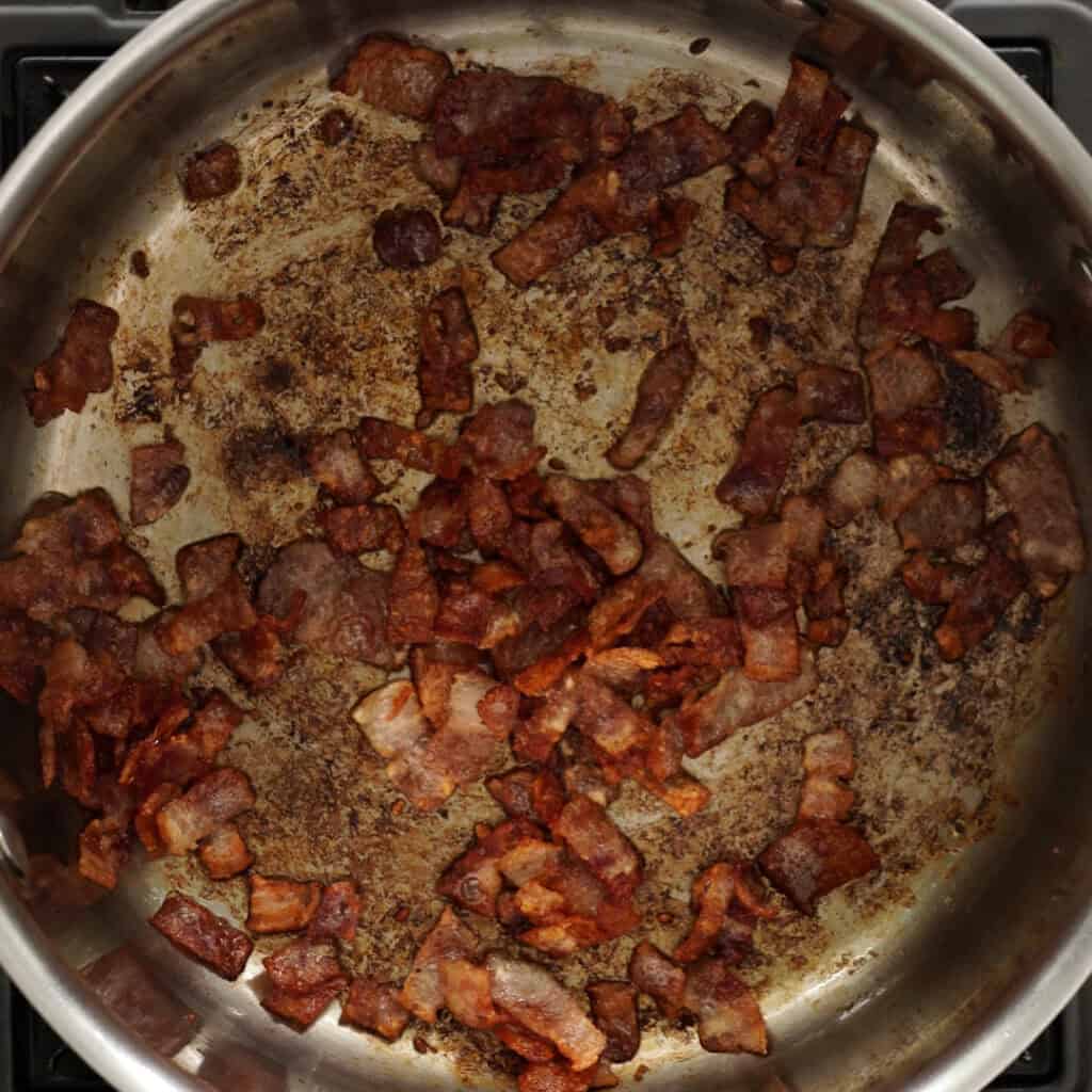 - Cook bacon until crispy. Take out the bacon, keep it aside. Retain about 1 tablespoon of bacon dripping in the pan and discard the rest.
