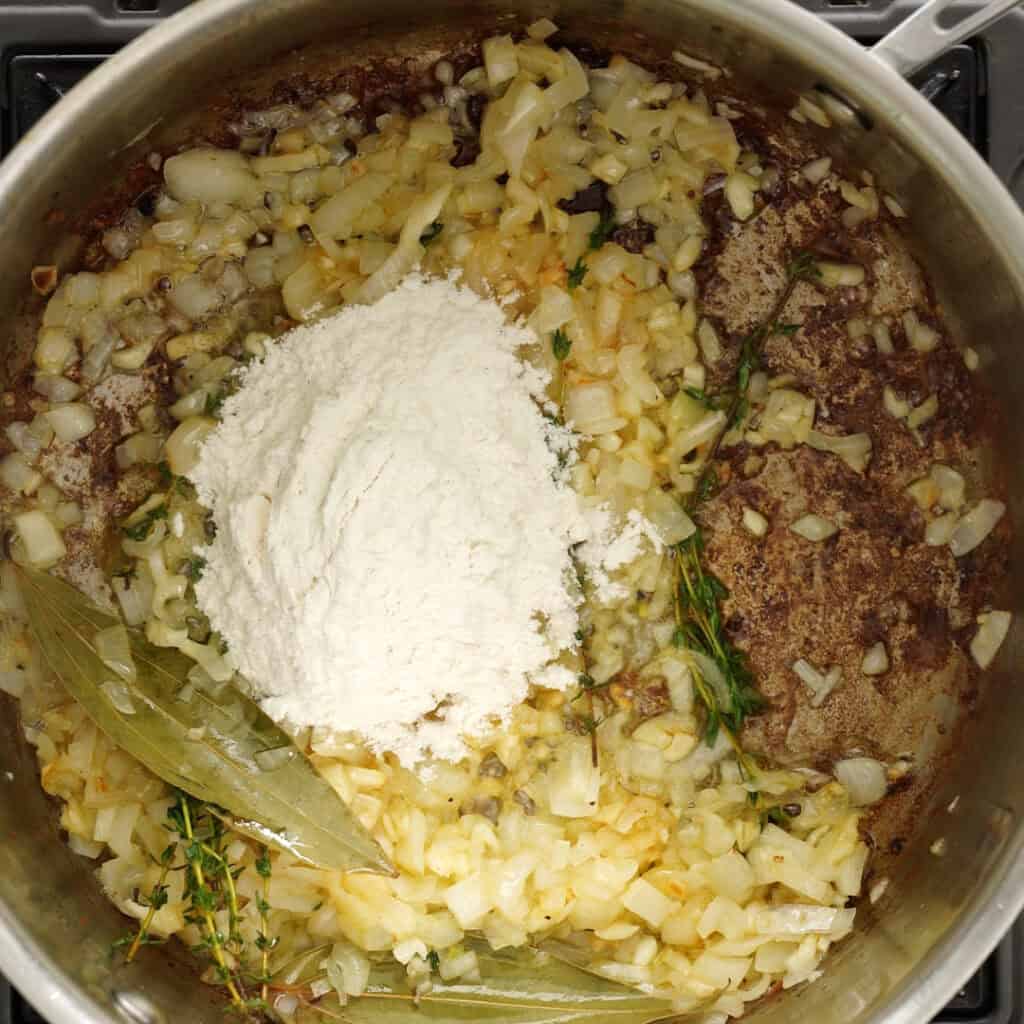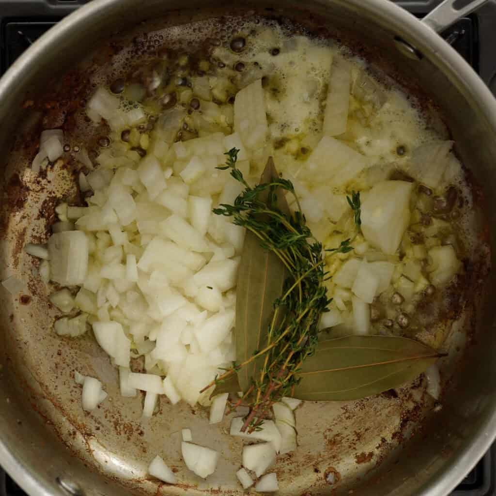 Saute onion, garlic, thyme, and bay leaf in butter until softened.