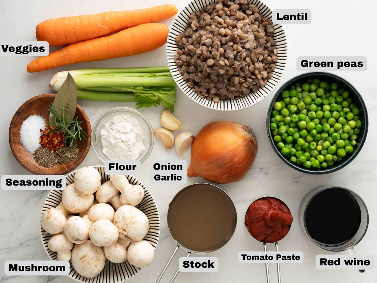 Start with Sauteeing Onion, garlic, celery, carrot, bay leaf, and fresh herbs. When aromatic add Mushroom. Saute mushrooms until it softens. Then goes the lentils, tomato paste, and flour. If you are not a fan of lentils, then increase the amount of mushroom, carrot, and peas to compensate.