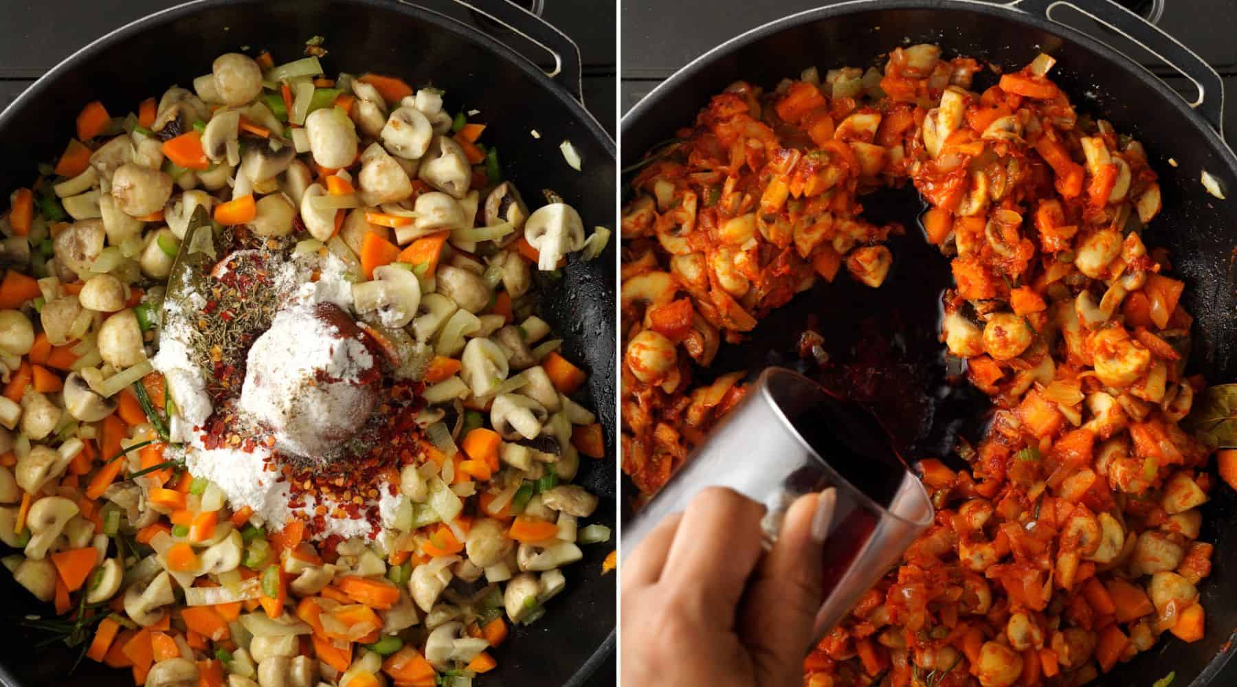 - Add wine, vegetable stock. Mix well, season with salt and pepper. Let it cook on medium heat until the gravy starts to thicken.