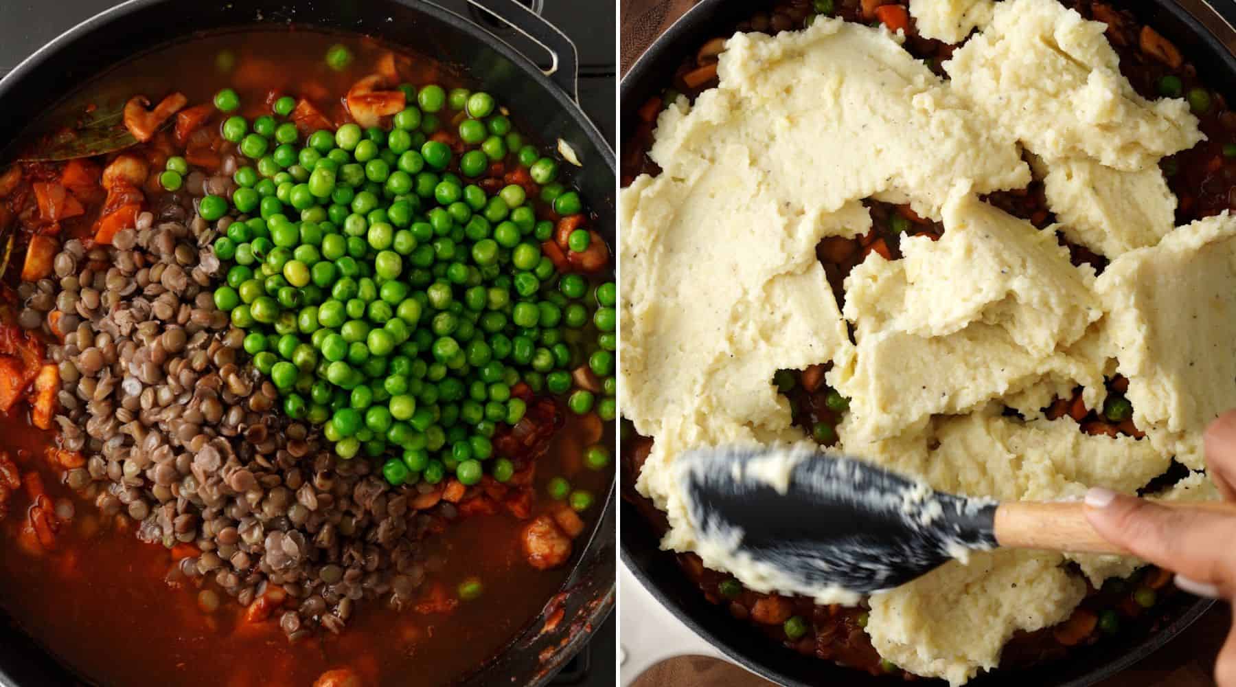 - In an oven-proof pan put the vegetable gravy. Top with mashed potato in an even layer.