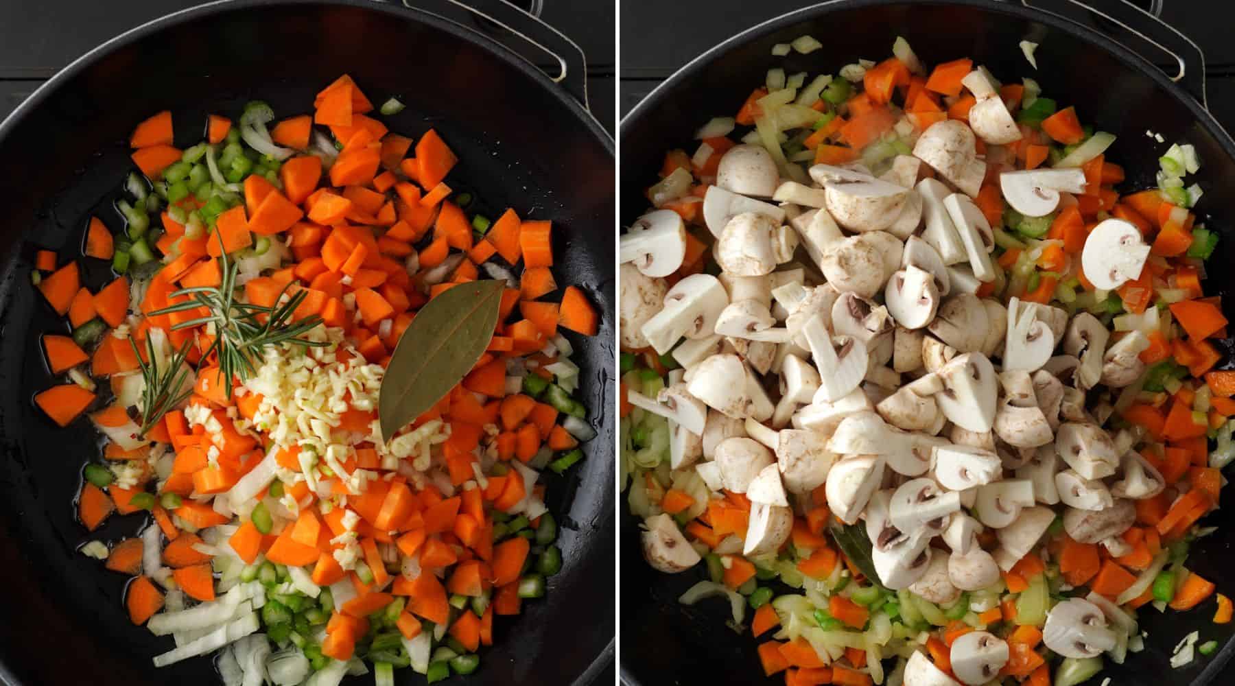 Start with Sauteeing Onion, garlic, celery, carrot, bay leaf, and fresh herbs. When aromatic add Mushroom. Saute mushrooms until it softens.