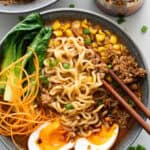 Spicy Pork Ramen takes less than 20 minutes to make. A flavourful broth with a secret ingredient for extra depth of flavour, ramen noodles, spicy pork is comfort in a bowl, especially for cold winter days.